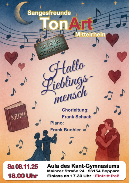Am Samstag, 8. November, ist es wieder so weit: Das Herbstkonzert der Männer von TonArt Mittelrhein steht an. Auf der Bühne der Aula im Kant-Gymnasium Boppard präsentieren die Klangkumpels um Chorleiter Frank Schaab ihr Programm „Hallo Lieblingsmensch“.